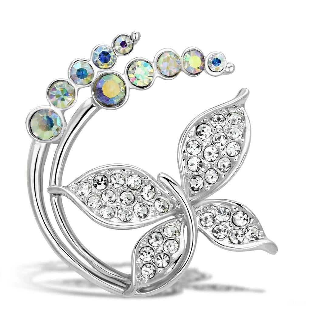 This beautiful flash gold brooch adds a touch of sparkle to any outfit. The butterfly design features aurora borealis crystals that create a rainbow effect when they catch the light, all set in white metal with flash gold plating. It's a lightweight piece that's easy to wear all day.
